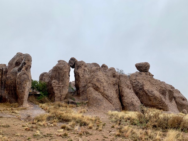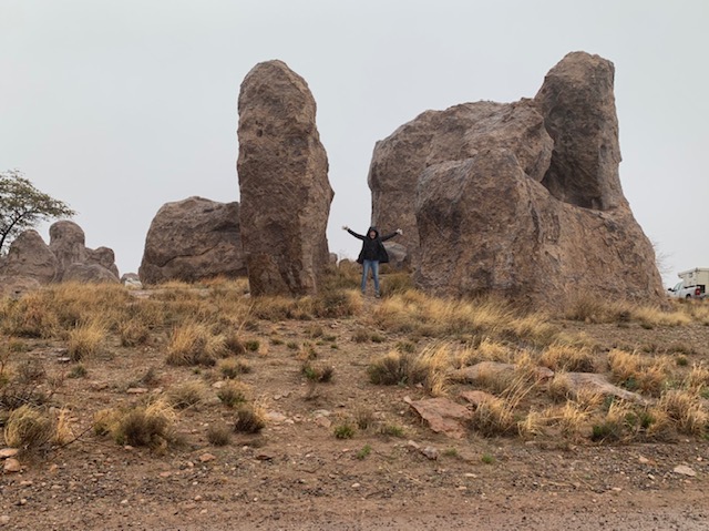 After a coffee shop planning session, where we noticed the small town Cheers, everybody knows your name cast of regulars come through, we got set up at the local KOA. It was our first time going to one and it was nice enough, a campsite with WiFi and hot showers for twenty bucks is definitely worth it some times. Then we were off to The City of Rocks, a huge outcropping of volcanic stones. We watched the edutainment VHS circa 1991 at the visitors’ center and the rain picked up. We decided to stay dry and just take the perimeter road around the place. Kate jumped out for a photo op and startled something, maybe a bobcat, trying to stay dry like we were.