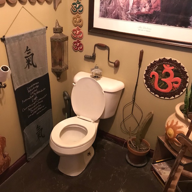 When the sun came up and we braved the cold world outside I expected we’d been through a small blizzard, but there was maybe half an inch of snow on the ground. That was enough to stop us from going to the Gila Cliff Dwellings as planned though, so we found another wonderful coffee shop and made friends with some fellow travelers from Texas. I took a picture of the bathroom decked out in eastern wisdom in homage to Jesse’s Banos Around the World.