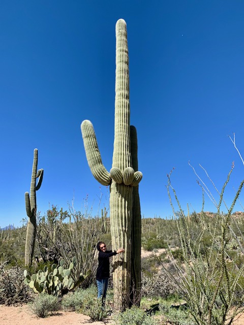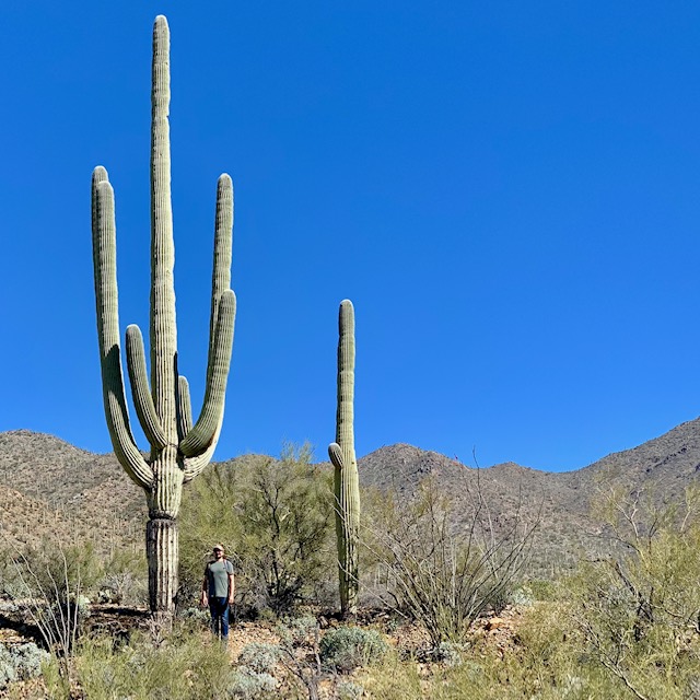 The Tohono O’odham say that the saguaro are people, and walking among them you can feel it. We couldn’t help but talk to the cacti, and ascribe human qualities to them. For the most part we had the trail to ourselves, but it felt like we were walking through a party. At one point we did meet an actual human person, a parks volunteer who taught us some of the birds we were hearing (cactus wren, curved-bill thrasher, and mostly pyrrhuloxia, the cardinal’s hard rock cousin,) and chatted with us about New York City. Down the line we spotted a Gila woodpecker hammering on cacti, a family of gambles quail, and a hummingbird, whose tiny high pitched cry was just on the edge of our hearing.
