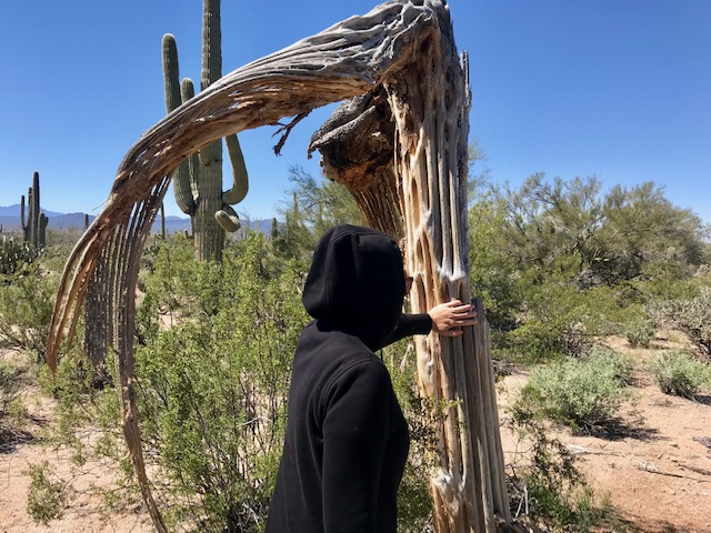 We found some baby saguaro, which apparently need “nurse plants” to shade them for the first few years of their growth. Often these small trees and bushes are choked out by the expanding roots of the maturing cactus (maybe parents can relate) as the saguaro’s shallow roots extend as wide as it is tall to collect precious water. We also found the woody ribs of a few dead ones. The Native Americans from this area, the Tohono O’odham, use this wood to fashion a tool for harvesting saguaro fruit from the top of these towering, spine covered plants.