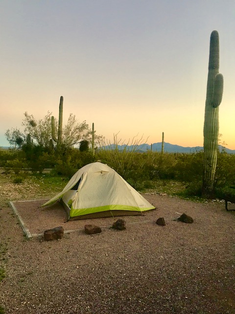 Despite our best efforts there were no spots available for us to camp; snowbird Boomers in RVs were everywhere. I came to a realization: Arizona is the Florida of the Midwest. (The more time I spend in the state the mod it proves out.) Undeterred, we drove to our next stop, Organ Pipe Cactus National Monument, where we got one of the last tent spots in time for sunset. It was a beautiful location, with the lights of Sonoyta, Mexico down below us, the desert all around us, and a cactus friend beside us. What a life.