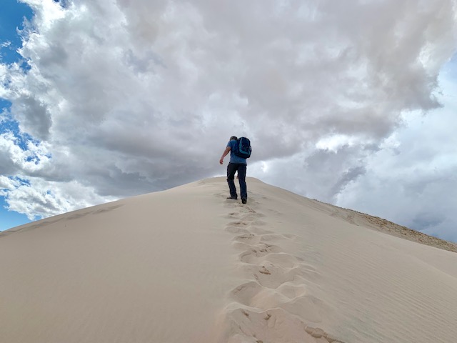 You can’t stay at the top of the mountain forever, and it was time to head back. Ryan began hiking down the way we came, a gradual descent from dune to dune. Having seen a speck of a man jumping down the side of the mountain earlier, I had other ideas. I took off my shoes and socks, packed them in my bag and began jumping down the face. My feet sank in up to my shins with each jump and I began gaining momentum. In a few short seconds I was in a Willy Wonka world, walking on a wall, legs perpendicular to the dune I was descending. I think I laughed; I think I screamed. Ryan joined me on the slow motion fall, and we made it to the base laughing with incredulity.